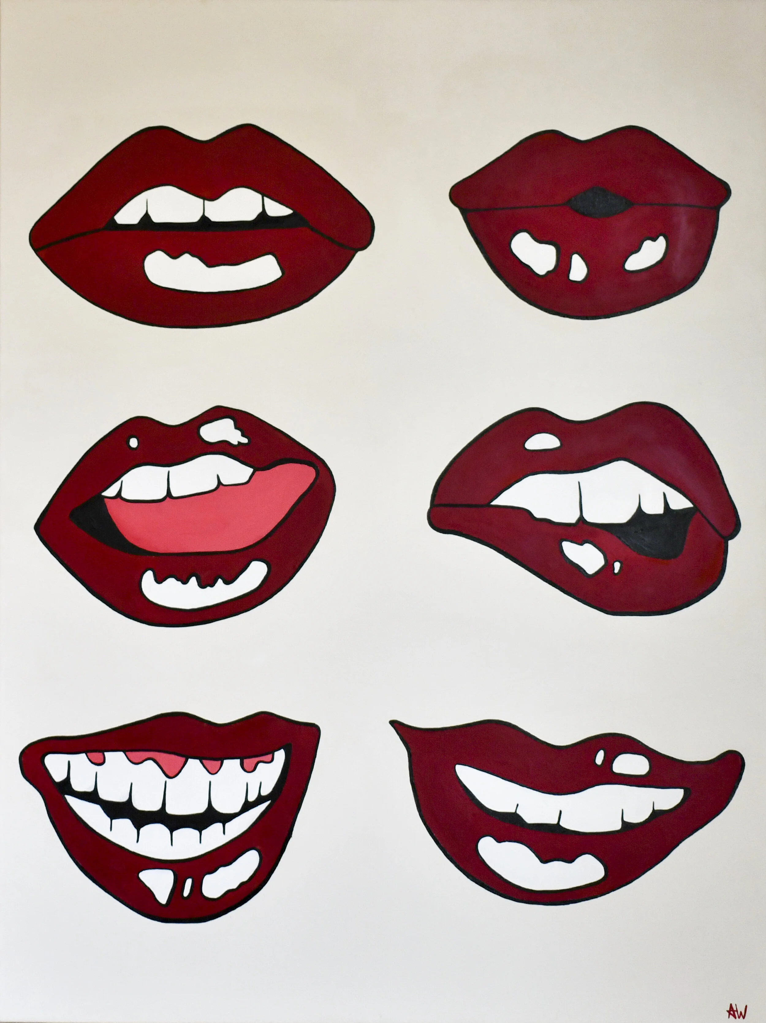 The sources of inspiration for these paintings have come from personal photos and stories, magazine articles, popular culture, and art from that time period and now. As far as composition, my work revolves around the idea of using a simple subject, or just a piece of a larger subject, and then displaying it on a large canvas. This allows for complexity in the finer details, color palette, and brush techniques. The color palette of these paintings are in neutrals and various shades of reds and pinks. Red has always been a symbol for power, but it also represents femininity, passion, ferocity, etc. The color palette and scale of these paintings is essential to the narrative of these images and how the viewers will encounter them.