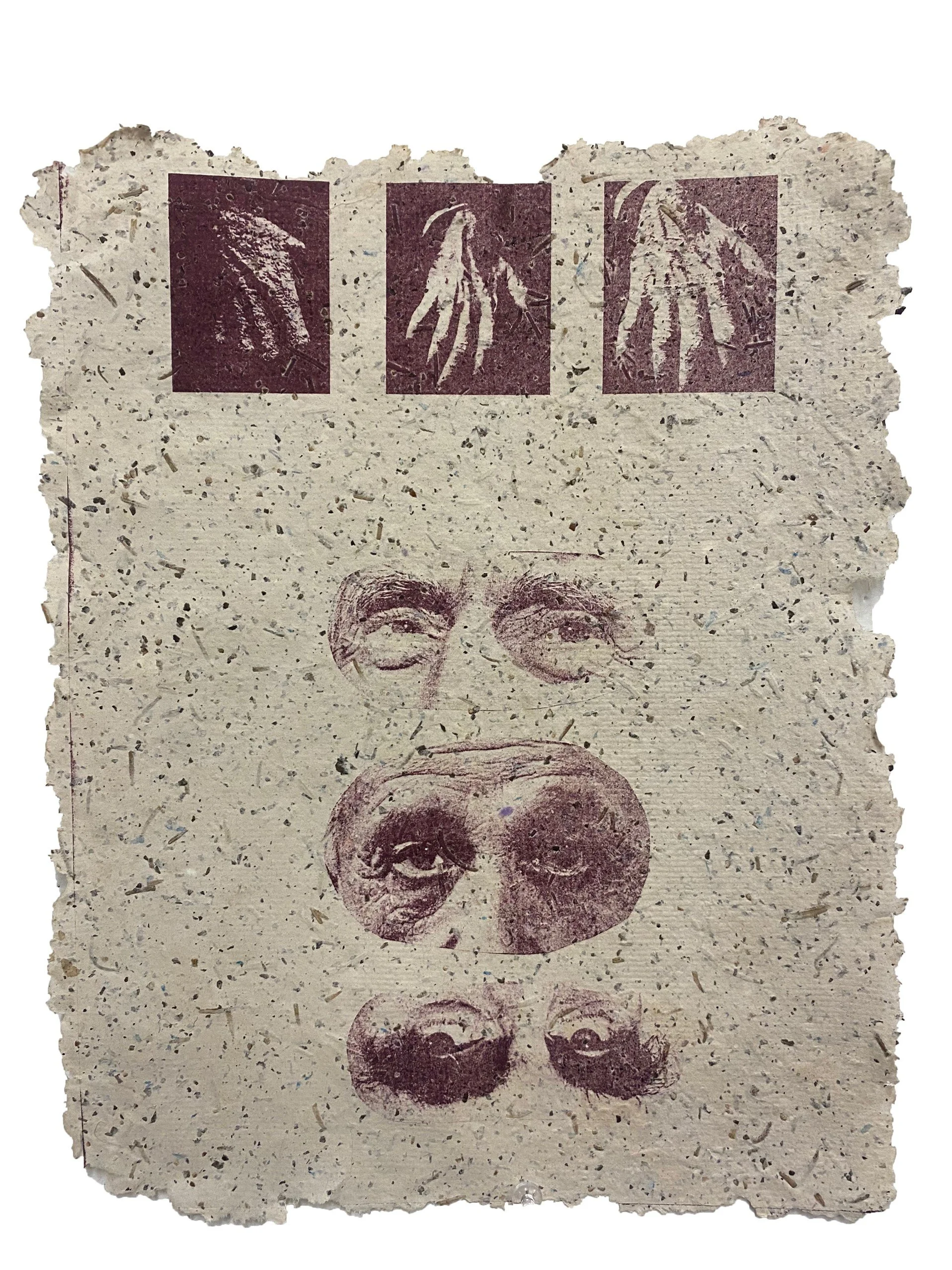 This body of work is a collection of lithograph prints on handmade paper, which has the effect of a manuscript. During my time at UMSL, I noticed how much paper the university went through and I decided to do something about the waste. I gave the paper shreds new life by grinding them down and repressing them as sheets of paper, which I infused color, seeds, and herbs into and then print collage based images on top of. My imagery is a collection of recovered photographs from trashed or torn books that I find and piece back together to create a brand new image. After I print the image, I then add metallic elements to the prints to manifest the illuminated manuscripts of the medieval age.